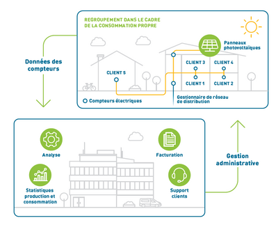 Les membres du regroupement bénéficient ainsi d’une facture uniforme par membre (transmise par voie électronique ou sous pli avec bulletin de versement), incluant toutes les sources d’approvisionnement (installation photovoltaïque et réseau électrique).